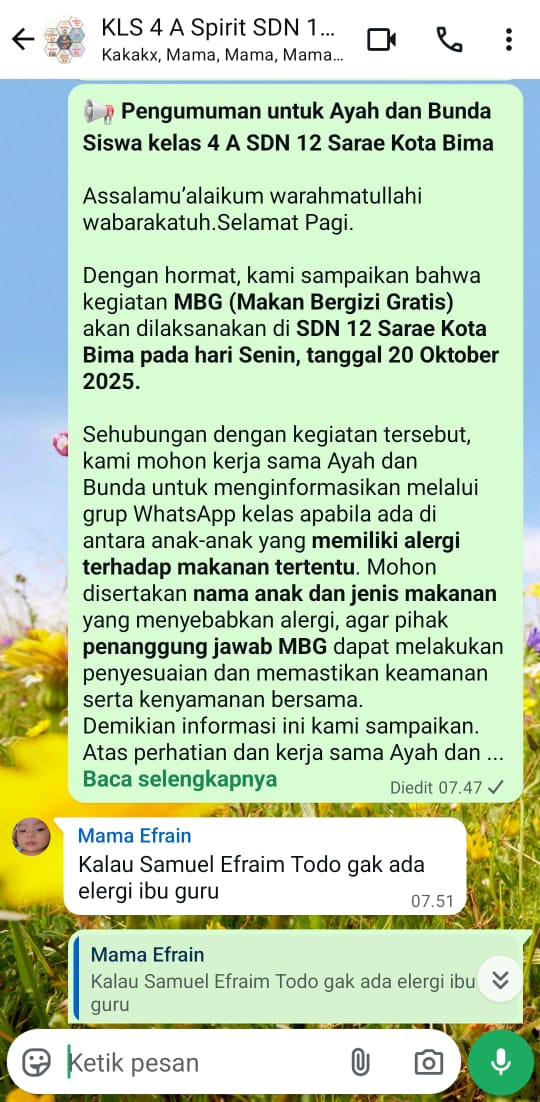 Respon positif pun mengalir dari para orang tua di grup. Mereka menyambut dengan antusias dan berterima kasih atas informasi yang diberikan. Semoga kegiatan MBG nanti membawa manfaat besar bagi kesehatan dan semangat belajar peserta didik SDN 12 Sarae Kota Bima.