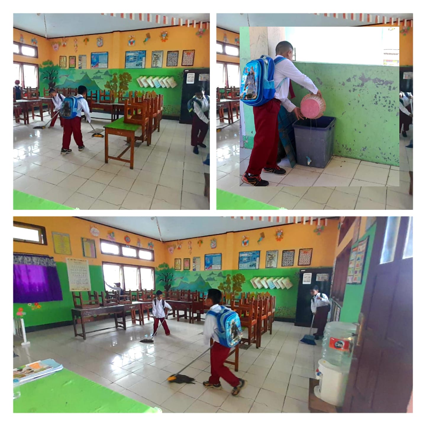 Ada yang menutup dan membuka jendela, menghapus papan tulis, menyapu lantai, mengepel, hingga membuang sampah ke tong sampah. Semua dilakukan dengan kerja sama dan rasa peduli terhadap kebersihan lingkungan kelas.