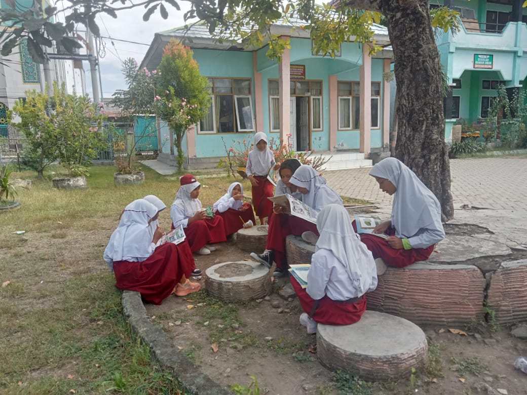 Di bawah pepohonan yang rindang dan udara yang sejuk, para siswa tampak asyik membuka lembar demi lembar buku bacaan. Ada yang membaca cerita rakyat, komik edukatif, hingga buku pengetahuan umum. Kegiatan spontan namun penuh makna ini menjadi pemandangan yang indah di tengah semangat gerakan literasi sekolah.